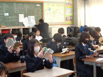 読書の時間。3年生の教室はまばらです。3年生は今日もたくさんの生徒が私立高校入試に臨んでいます。がんばれ3年生!