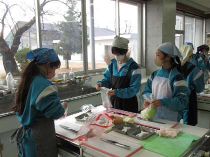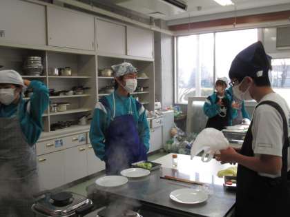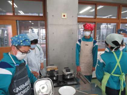 蒸し野菜の調理実習に協力して取り組んでいます。調理方法を工夫すると、野菜もたくさん食べられますね。