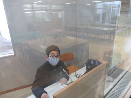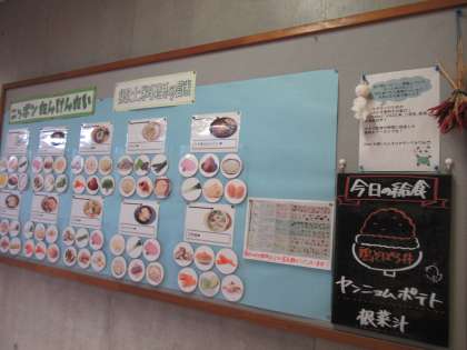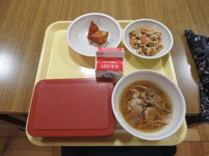 今日の献立は鶏そぼろ丼、温かい根菜汁、韓国風の味付けをたヤンニョムポテトです。たくさん食べて午後も頑張りましょう。