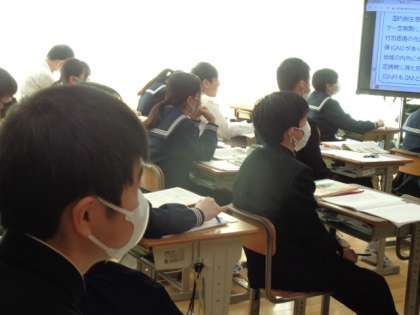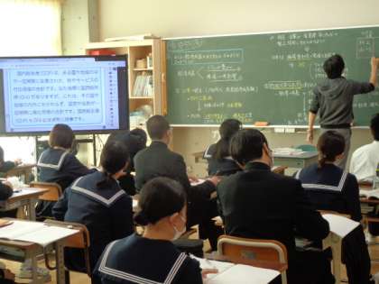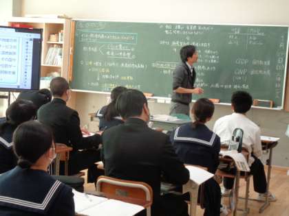 3年生の社会の授業は、経済について。日本と外国の違いについての先生の解説を、真剣に聞いていました。