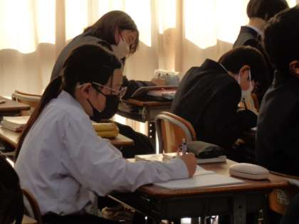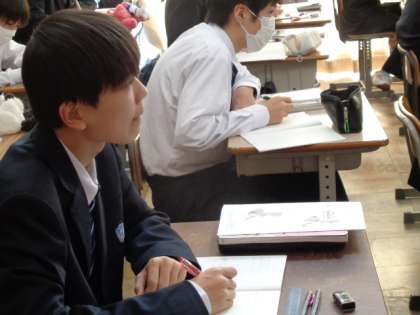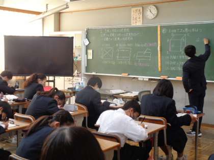 1年生の数学の授業は、直線と平面の関係について。先生の説明を真剣に聞いていました。
