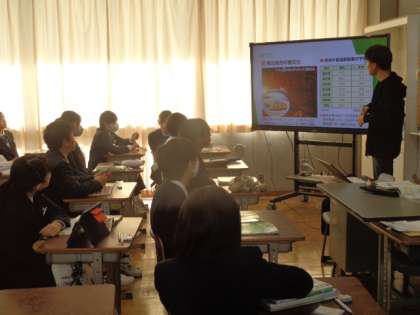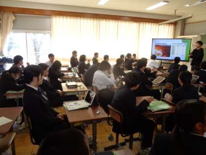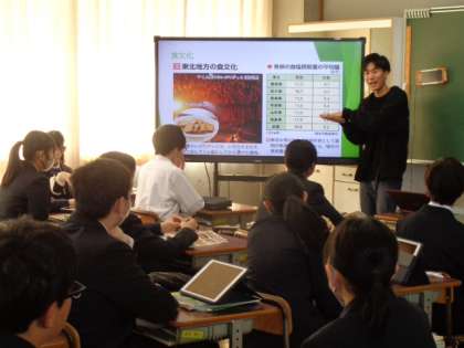 2年生の社会の授業は、東北地方について。電子黒板を用いて、食文化で知っていることを挙げていました。