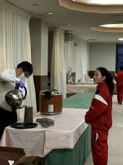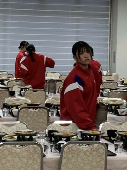 もうすぐ2日目の夕食時間です。食事係、手際よく準備しています。