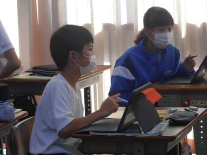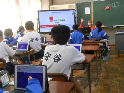期末テストを前に、1年生の英語の時間では、端末を活用し、オンラインアプリKahootで、これまで出てきた文法事項などについて、クイズ形式で楽しく復習しました。