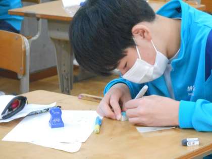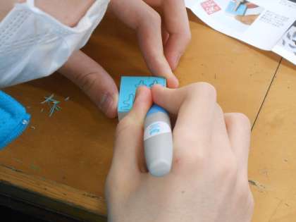 彫刻刀で、あらかじめ考えておいた文字を彫って、てん刻を制作しています。彫る面は、石ではなくゴムとなっていて、軽く三角刀などで彫ることができます。