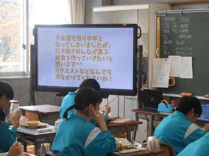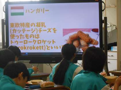 ただ黙々と食べるだけでは寂しいと、栄養教諭の柳田先生がいろいろな国の食べ物を画像とともにその特徴などを音楽に合わせて紹介しています。