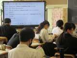 場面に応じて,英語で苦情を言ったり,謝ったりすることを学習しています。ホテルの部屋の冷房が故障している場面で,どのように言ったり,答えたりすればよいのかを考えています。