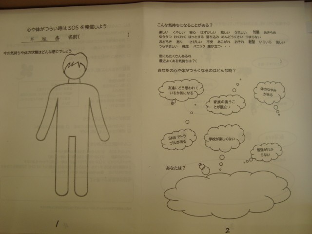 1年生を対象に、自分の心と体の健康を守るためのスクールカウンセラーによる授業を実施しました。授業の最初では、「同じ出来事が起こっても、人によって感じ方や反応が違うのはなぜだろう?」という問いかけからスタートしました。私たちは毎日、様々な出来事(事実)に直面します。その「事実」に対して、自分自身がどう「受け取るか(解釈するか)」によって、その後の感情や行動、そして未来が変わっていくことを伝えました。自分の「心のレンズ」を意識し、前向きに物事を捉えるヒントを提供しました。ワークシートでは「心や体がつらいときはSOSを発信しよう」に取り組みました。生徒たちは、色鉛筆を使って体のイラストに色を塗ることで、今の自分の状態を表現しました。授業のまとめとして、心がつらいと感じた時に一人で抱え込まずに実践できる具体的な「心の対処方法(コーピング)」をいくつか紹介してくださいました。「困った時は遠慮なく助けを求めていいんだよ」というメッセージを伝え、学校には皆さんをサポートする様々な大人がいることを再確認しました。
