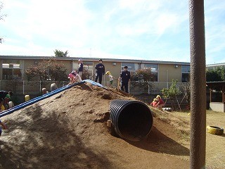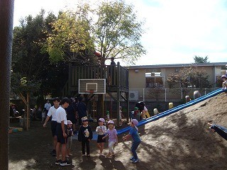 園庭では、生徒が率先しておにごっこをしたり、どろんこ遊びをしたり、やまのぼりを見守ったり、優しくおままごとをサポートしたりするなど、まるで本当のお兄さん・お姉さんのように、熱心に園児たちのお世話をする姿が見られました。