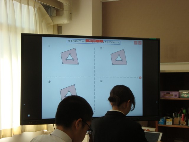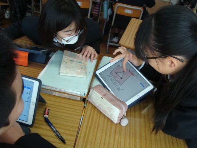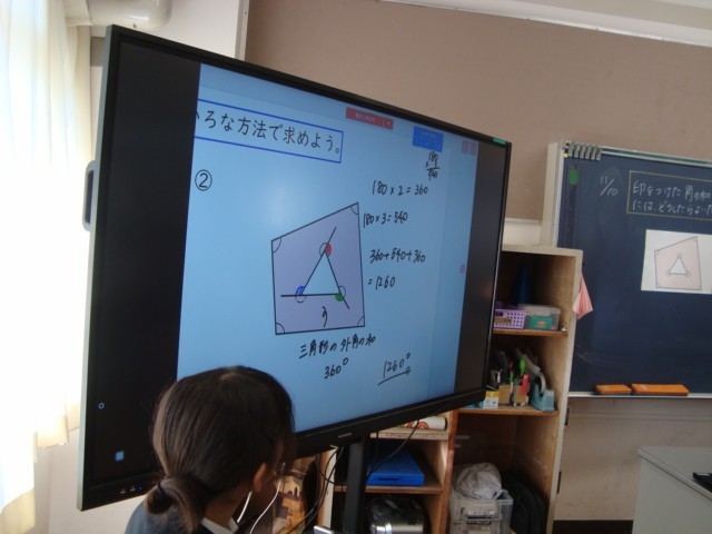2年生 数学:「平行と合同」 ICTを活用した深い学び 公開日 2025/11/10 更新日 2025/11/10 学校全体 現在、2年生の数学では「平行と合同」の単元を学習しており、多角形の角の和を求めることに取り組んでいます。多様な考えで自力解決し、グループで学び合い、ICTの活用で様々な考えを瞬時に共有することができます。今日の授業では最終的に公式を導き出していました。「なぜそうなるのか」という原理を深く理解し、本校の生徒は論理的な思考力と課題解決能力を育みつつ、主体的に、楽しく学んでいます。