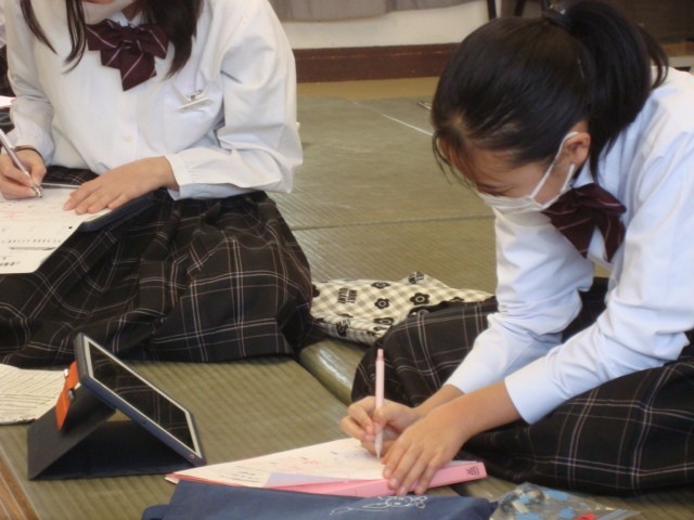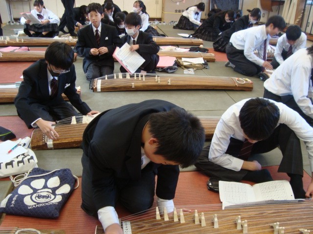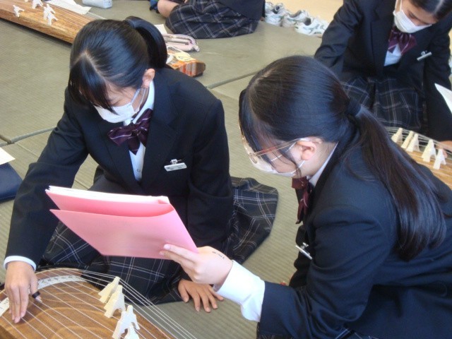 1年生の音楽の授業では、日本の伝統楽器、琴の学習が進行中です。今日は「さくらさくら」の演奏を通し、音色を際立たせる重要な技法であるすくい爪の練習に励みました。練習後、生徒たちはペアになり、お互いの手元を動画で撮影しました。その動画をすぐに確認し、「指の角度が違う」「もっと優しく弾くべきだ」など、演奏技術や姿勢について具体的な振り返りを行いました。デジタル機器を活用し、伝統文化の技術を効率よく習得しようとする、意欲的な学習風景が見られました。