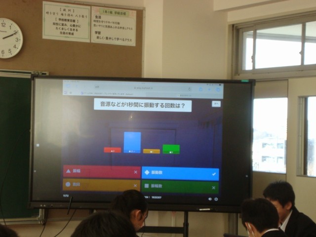 理科 新年の学びは「カフート」で熱くスタート! 公開日 2026/01/08 更新日 2026/01/08 1学年 新年明け、1年生の理科の授業が元気に始まりました。冬休み明けの最初の時間は、ICTツールのKahoot!(カフート)を活用した、これまでの学習内容の総復習クイズ大会です。大型モニターに問題が表示されると、生徒たちは手元のタブレットを使って素早く回答!正解や順位がリアルタイムで更新されるたびに、教室には歓声が沸き起こりました。楽しみながらクイズに取り組む中で、冬休みモードから一気に「学びのスイッチ」へと切り替わったようです。このエネルギーをそのままに、今後の新しい学習単元にも意欲的に取り組んでいけることを期待しています。