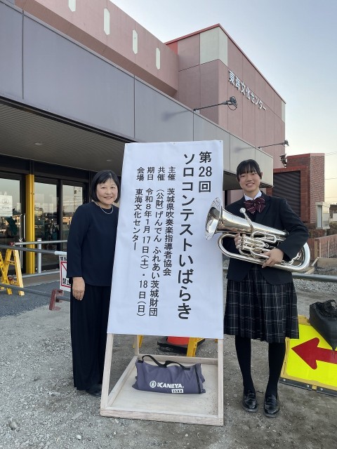 1月17日(土)に、東海文化センターで「ソロコンテストいばらき県大会」が行われ、本校から出場した2年生のユーフォニアム奏者が見事「銀賞」を受賞しました。日頃の練習で培った高い技術と音楽表現を、大舞台で堂々と披露することができました。伴奏を務めてくださった先生との息もぴったりと合い、信頼関係が伝わってくるような温かいハーモニーが響き渡りました。この素晴らしい経験を糧に、さらに自分らしい音色を追求していってください。おめでとうございます!