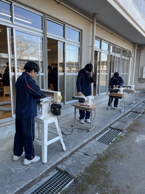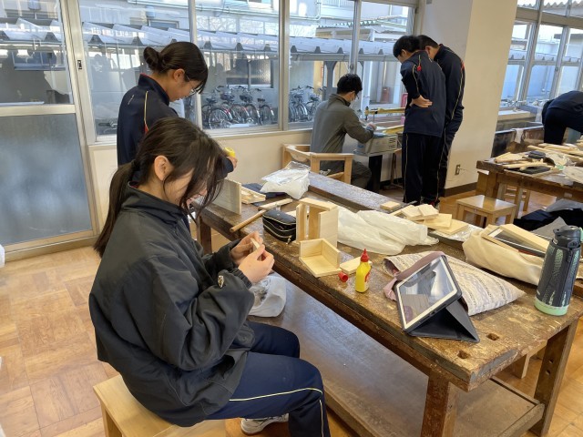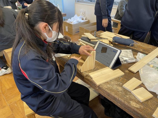 技術の授業では、生徒一人ひとりが自分の製作計画に沿って作業を進めています。「オンライン技術室」には、工具の使い方や加工のコツが動画や板書の写真で詳しく解説されています。生徒たちは、自分の進度に合わせて端末で手順を確認し、「次はどうすればいいか」を自ら考えながら、集中して作品に向き合っていました。一斉授業とは異なり、必要な情報を自分で見つけ出し、試行錯誤しながら進める姿からは、今の時代に求められる「自律的な学び」の深まりが感じられます。完成が今から楽しみです。