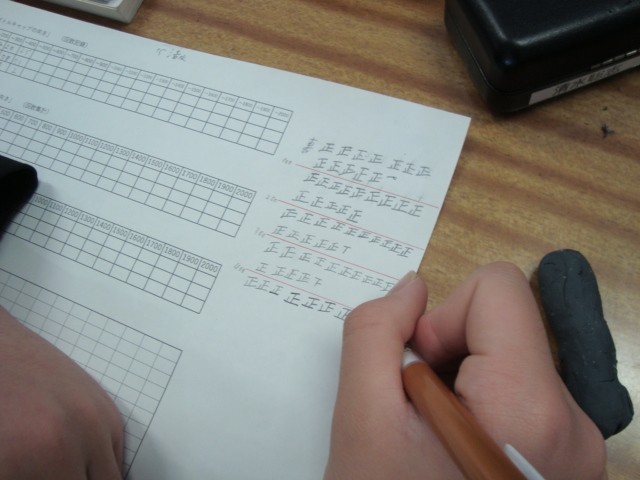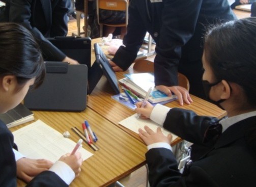 1年生の数学では、身近なものを使って「確率」を学ぶ実験を行いました。課題は「ペットボトルキャップを落として、裏になるか表になるか」。各グループで何度も繰り返し、その結果を「正」の字でメモしたり、カウンターアプリで手際よく集計したりしました。膨大な試行回数を重ねることで、一見バラバラに見える結果の中に潜む「数学的なきまり」を体感。アナログとデジタルの両方を使ってデータを集める、1年生らしい活気ある探究の時間となりました。