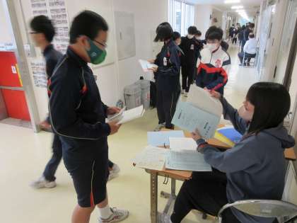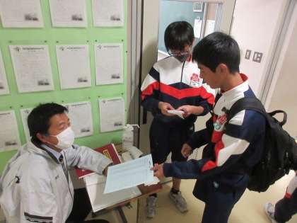 教室前では,担任と挨拶を交わし,提出物を担任に渡したり,机消毒の紙をもらったりしながら,教室に入っていきます。