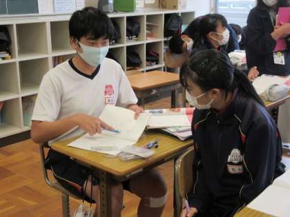対頂角が等しくなることを友達と話し合って,考えています。考え方が分かっても,それを書いて表現することが難しいようです。