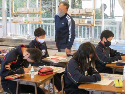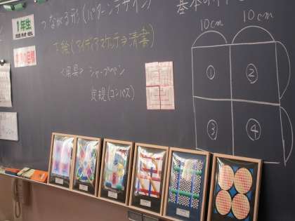 つながる形(パターデザイン)の学習です。例を参考に下絵を描いています。集中しています。