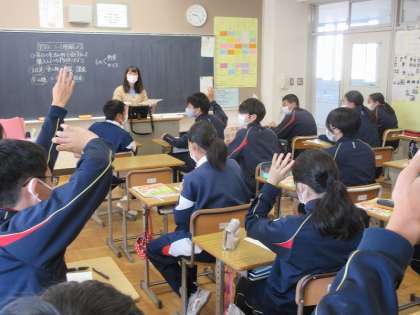 2年生 家庭科の授業 公開日 2021/10/21 更新日 2021/10/21 2学年 消費生活と契約について学習することで消費者トラブルを解決する方法を考えています。質問に対し,積極的に挙手をしています。