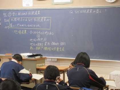 2年生 社会科の授業 公開日 2021/10/22 更新日 2021/10/22 2学年 由貴に囲まれた伝統産業の学習をしています。北陸地方ではなぜ伝統産業が盛んに行われているのかを写真や資料を見ながら考えています。