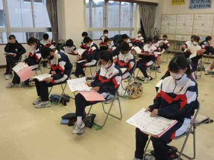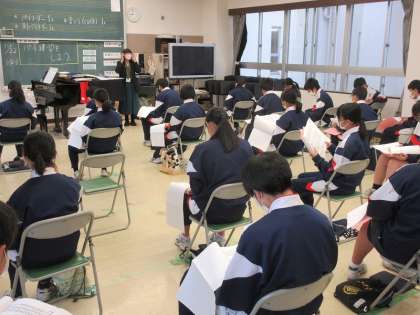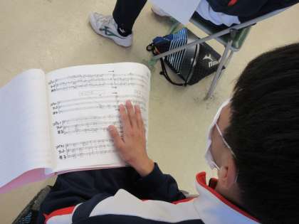 合唱曲を聴いています。パート毎の音を聴き,自分のパートを覚えています。