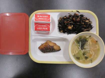 今日の献立は,ご飯,牛乳,鯖のみりん干し,ひじきの煮物,大根の味噌汁です。