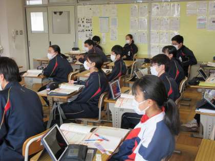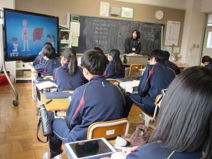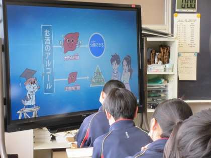 飲酒の量と健康について学習しています。飲酒によって,人がどのような状態になるのかを話し合いました。アルコールを分解する肝臓について映像を見な観ながら理解を深め,未成年への影響を学習していきます。