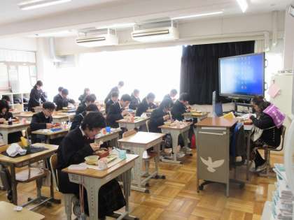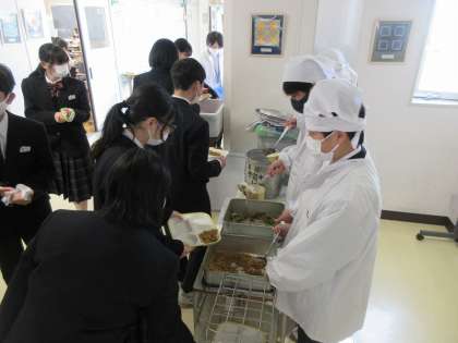 今日の献立は,ご飯,牛乳,ビビンバ,ナムル,もずくスープです。静かに配膳をし,静かに食べることが習慣化されています。お昼の放送,いつもありがとう。