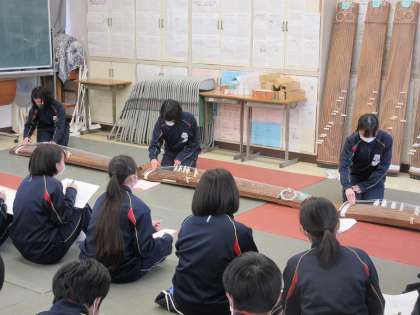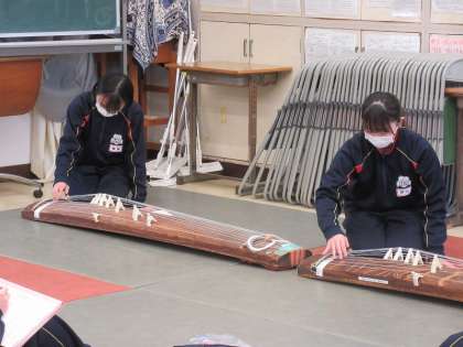 お琴の発表会をしています。2人や3人で「さくらさくら」の曲を2年生は,スクイ爪,合わせ爪を使い,演奏していました。弦の響きが美しく,息の合った演奏でした。聴いている生徒も,温かい雰囲気でした。すばらしい!