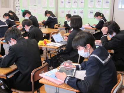 みんなに紹介したい「名言」について考えています。自分に与えた影響等を振り返り,1枚のシートにまとめていきます。