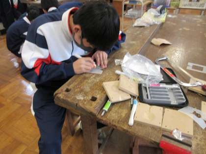 鋳造してキーホルダーをつくっています。ヤスリで削ったり,耐水ペーパーで水研ぎをしたりして仕上げています。冷たい水で手を汚しながらも楽しそうです。