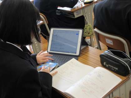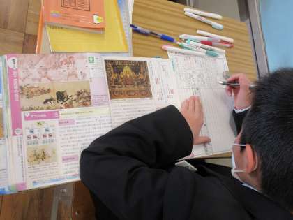 平安時代後半から鎌倉時代前半までの内容で新聞を作成しています。教科書,資料集,タブレットなどを使って,意欲的に取り組んでいます。