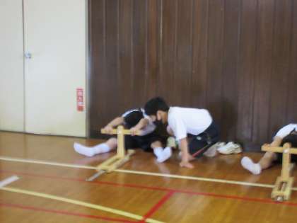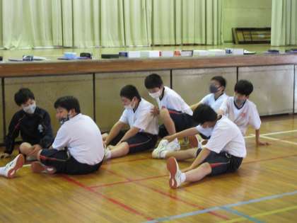体力テストをしています。長座体前屈をしています。待っているときにも,ストレッチ等をして準備をしています。