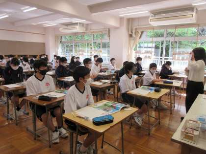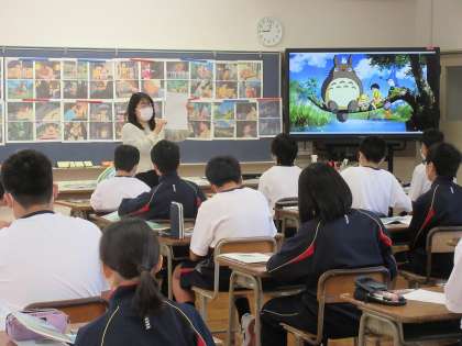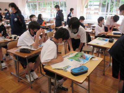 授業のオリエンテーションをした後,「物語を考えよう」の学習をしています。4枚の場面を繋げて,物語を想像します。表情や描かれてれいるもの,色合いや風景などに注目して,物語を作っていきます。楽しそうな4枚の絵が配付されました。