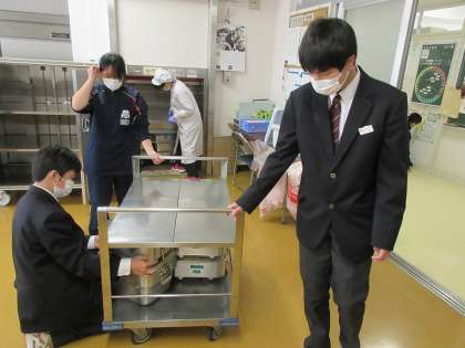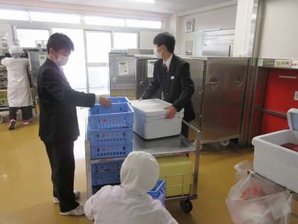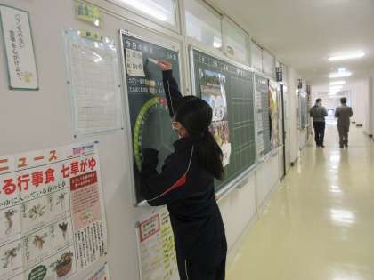 1階の配膳室で給食委員さんが給食後の後片付けをしてくれています。各フロアから3台のワゴン、計9台のワゴンが降りてきます。それを,コンテナに移し替えてくれています。手際がいいです。また,明日の献立を黒板に記入してくれています。いつも,ありがとう。