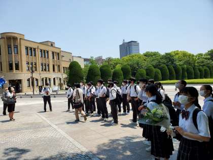 広島原爆ドーム公園で話を聞いてます。
