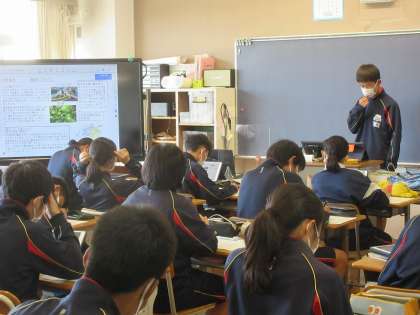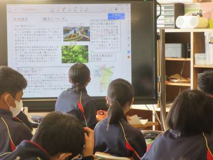 日本の各地方の気候,自然環境,農業,観光など,各自調べ,メタモジにまとめたことを発表しています。自信をもって発表しており,まとめたことが,電子黒板だけでなく,個人個人の端末でも見ることができ,とても分かりやすいです。