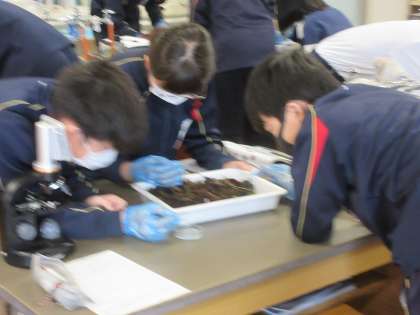 土の中には,どのような生物がいるのかを観察しています。ピンセットを使って,土の中を目をこらしながら探しています。