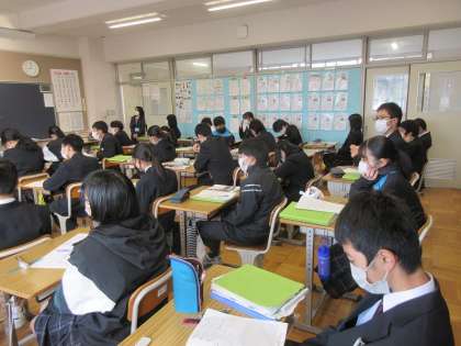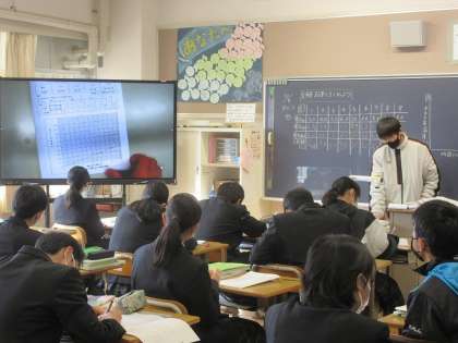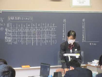 電力や電流を流す時間と電熱線から発生する熱量の関係について学習しています。実験結果をグループ毎に発表し,全体で共有しています。実験結果から考察をしていくようです。