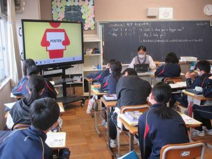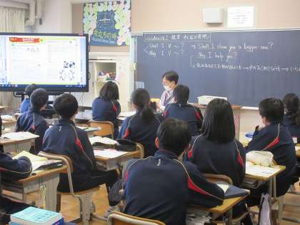 May I help you? 「〜しましょうか?」等の,手アインや申し出の表現について学習しています。デジタル教科書の動画を観て,理解を深めています。