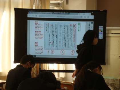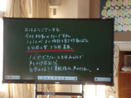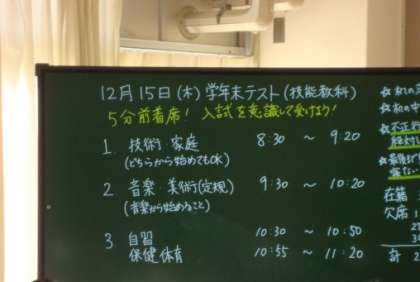 本日は,3年生が後期テストです。テスト日程が電子黒板に書かれています。以前のものと比べて,画面の明るさ,鮮やかさが際立っています。書き心地もいいようです。真ん中の写真は担任の先生からの朝のメッセージです。温かい言葉が書かれています。窓際の逆光でも,はっきりと見えて,生徒にも見やすく,学習効率も上がると思われます。技術の進歩を感じます。