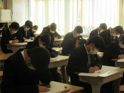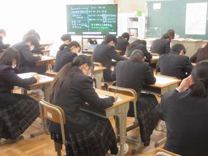 3年生は,今日明日と学年末テストがあります。今日が,技術・家庭,音楽,美術,保健体育のテストです。集中しています。頑張れ!