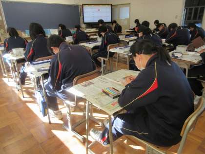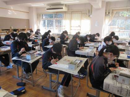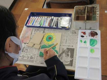 木彫りのリバーシブルスタンドを制作しています。彫るのが終わり,着色をしています。丁寧に取り組んでいます。