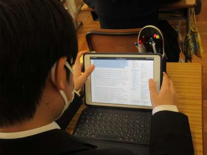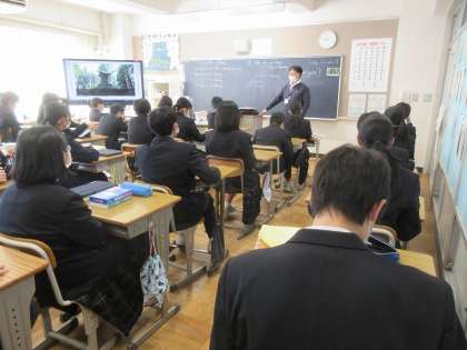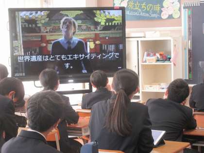 これからの学習内容の見通しを立てています。世界遺産について英語で紹介していくようです。日光東照宮の紹介ビデオを見て,イメージしています。