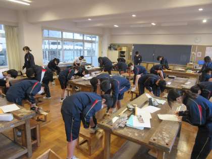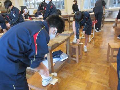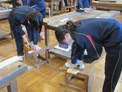 木材加工の学習です。これから本立てな等,木材を加工して作品を作っていきます。のこぎりで木を切る練習をしています。