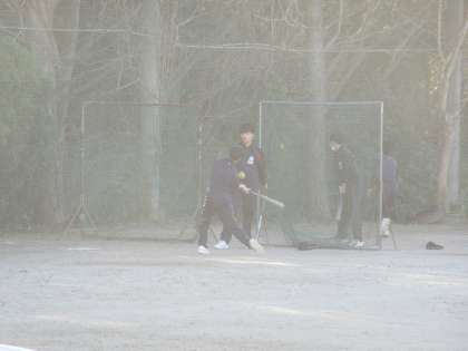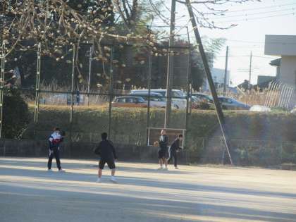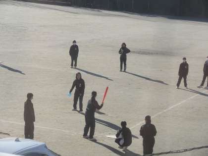 ソフトボール(女子は柔らかいボールとバットを使用)をしています。キャッチボールやバッティングの練習をした後,試合をしています。冬晴れのもと寒いですが,元気に活動しています。