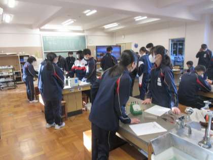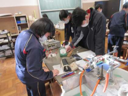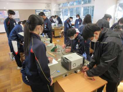 電流が磁界から受ける力について学習しています。磁界の中でコイルに電流を流すと,コイルはどのような力を受けるのか,実験をしています。実験方法を確認しながら,グループで実験を進めています。