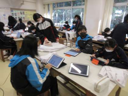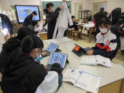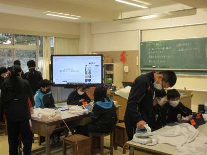 アイロンがけの実習をしています。アイロンがけの手順を確認し,アイロンをかけ,たたんでいます。そして,実習したことについてメタモジにまとめています。グループ毎に協力して取り組んでいます。