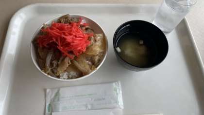 少し早いですが、ホテル最後の食事です! メニューは牛丼です!紅生姜はお好みで!