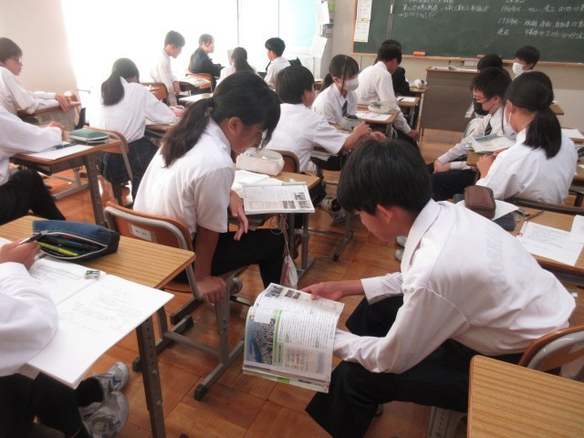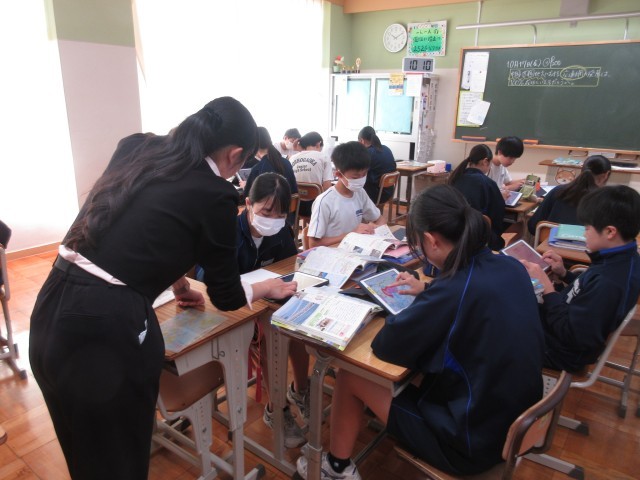 1年生と2年生の社会科の授業では、学習している内容は異なりますが、どちらの授業も資料を活用しながら、どのようなことが読み取れるかについて学習を行っていました。先生や友達に対して自分の考えを伝え合う協働的な学びの姿が見られました。